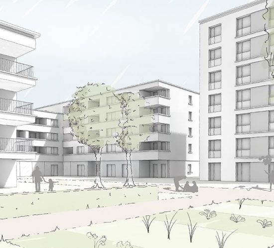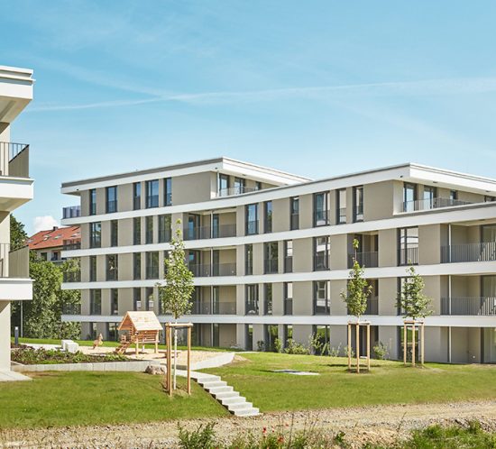 Die Winkel- und Turmbebauung mit 48 Wohneinheiten entlang der Rosensteinstraße bildet ein grünes Quartier mitten in Kornwestheim. Bestandsbäume entlang der Erschließungsstraßen wurden so weit wie möglich erhalten, neue Bepflanzungen bereichern die Tagespflege und Privatgärten. Zusätzliche Sitzbereiche auf dem Spielplatz bilden das Grundgerüst für ein durchgrüntes Wohnen mit einer hohen Aufenthaltsqualität.