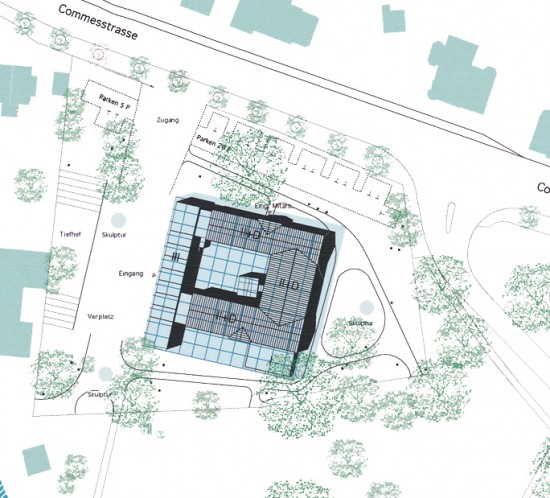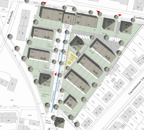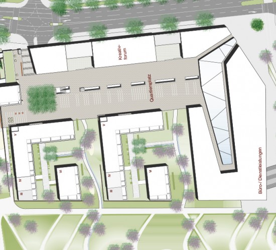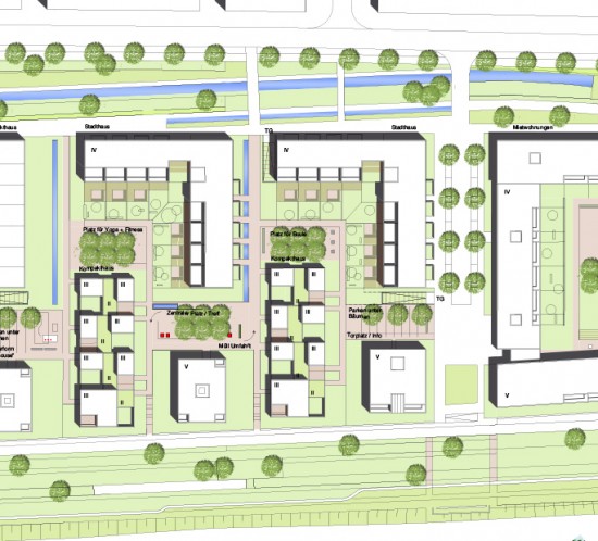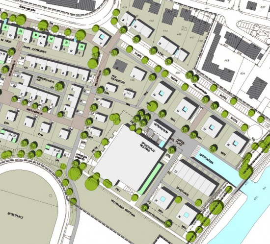 Die Flusslandschaft des Neckars, der vorhandene Baumbestand entlang des Neckars und der zukünftige ‚Hafenplatz‘ am neuen Vereinsheim bilden das Grundgerüst für ein durchgrüntes Wohnquartier mit einer hohen Aufenthaltsqualität und einer neuen Identität des Ortes. Das neue Vereinsheim wird aus o.g. Gründen an der Nordseite der Sporthalle geplant und begrenzt den kleinen Sporthafen mit angrenzendem Quartiersplatz. Um dem neuen Quartier eine klare Zonierung und Abgrenzung zum nordwestlich der Alleenstraße liegenden Gewerbeareal zu geben, werden an der Kreuzung 2 Punkthäuser als neues Tor/ Quartierseingang gesetzt